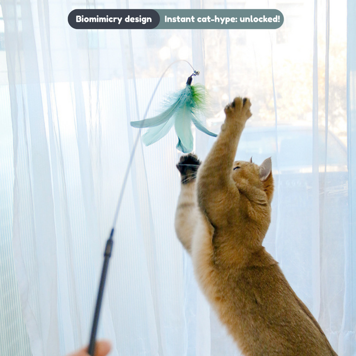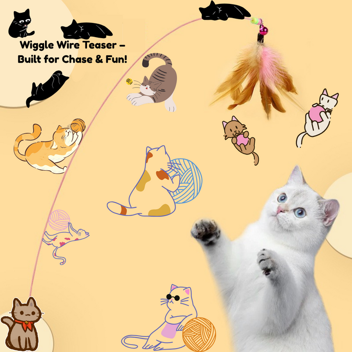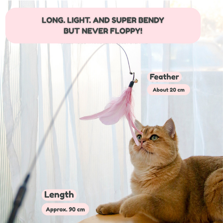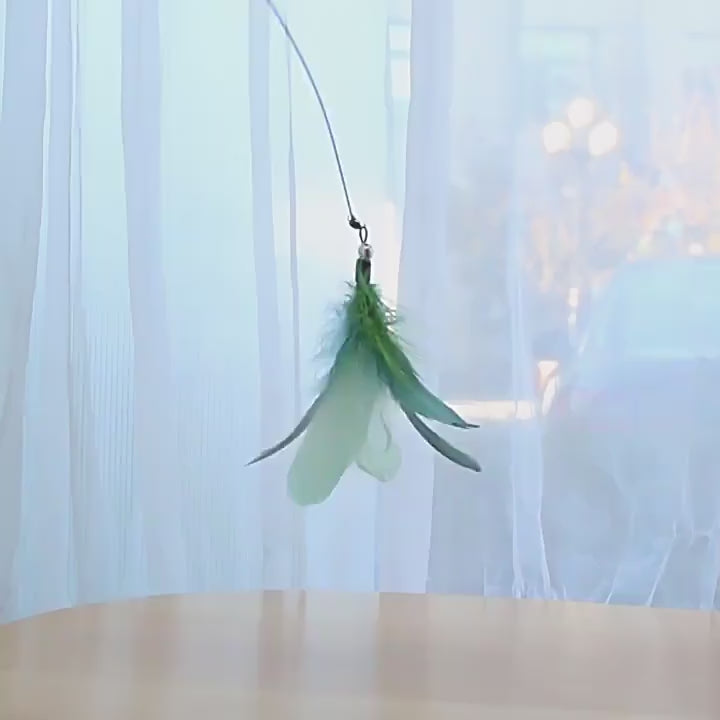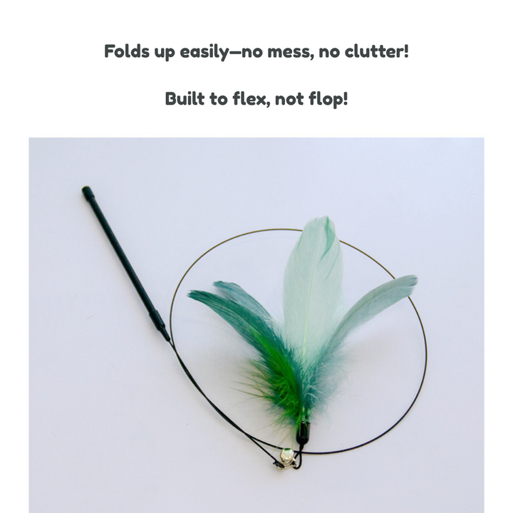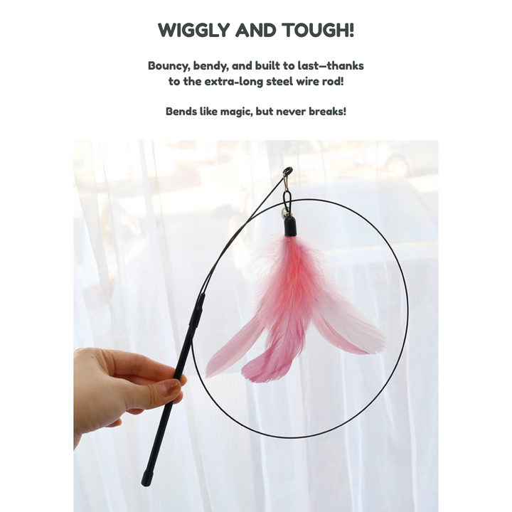 This extra-long, flexible steel wire wand is designed to bounce, wiggle, and spark your cat’s natural hunting instincts. With a soft feather tip, a jingling bell, and a bendy-but-tough build, it’s made for endless fun—without bending out of shape.
